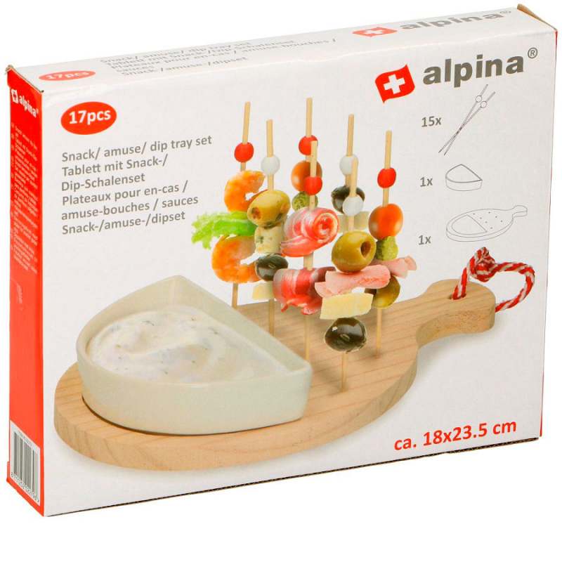 Accesorios para queso 17 piezas. Marca: Alpina. Medidas: 18x23.5cm. Material: Madera. Peso: 0,416Kg. Incluye: Bandeja, Bowl y 15 palillos. Atributos adicionales: Diseño ergonomico. Facil de usar. Sirve para servir cualquier tipo de comida. Facil de limpiar