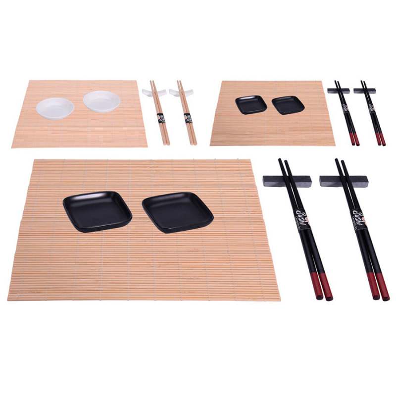 Accesesorios para sushi. Marca: Excellent houseware. Material: Porcelana y bambú. Incluye: 2 Platos de 8x8x2cm. 1 estera de sushi de 25x21x0,2cm. 2 palillos de 24x1,5x0,7cm. 2 posavasos - Set de sushi negro. Forma: Cuadrado. - Set de sushi blanco. Forma: Redondo. Los productos marcados como 'PRODUCTO SURTIDO' pueden no ser idénticos a los que aparecen publicados en las imágenes. Las imágenes son ilustrativas. Al comprar un producto identificado como producto surtido, aceptas que podrás recibir un producto con características y atributos tangibles diferentes a los que aparecen en las imágenes del sitio o la publicidad. Los productos surtidos mantendrán las propiedades físicas, químicas y técnicas necesarias para su funcionamiento y uso de acuerdo a su naturaleza.