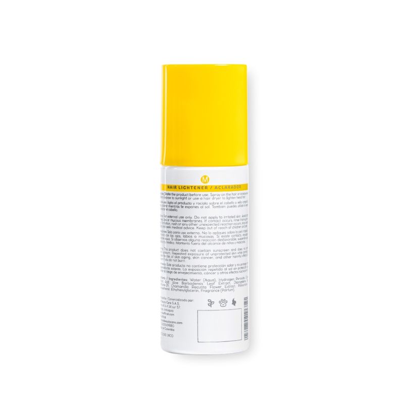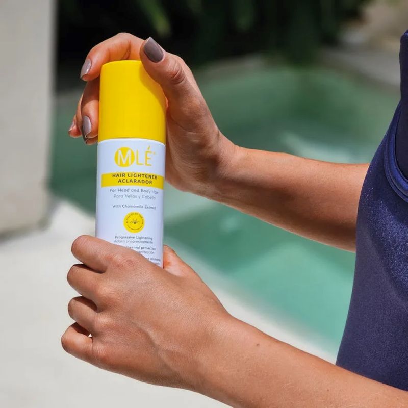 Aclarador Capilar MLÉ para vellos y cabello, aclara de forma gradual y progresiva con la acción del sol o el secador. Fórmula vegana y cruelty free que no irrita la piel ni maltrata el cabello, no acelera el crecimiento del vello y ofrece termoprotección para un uso seguro y efectivo.