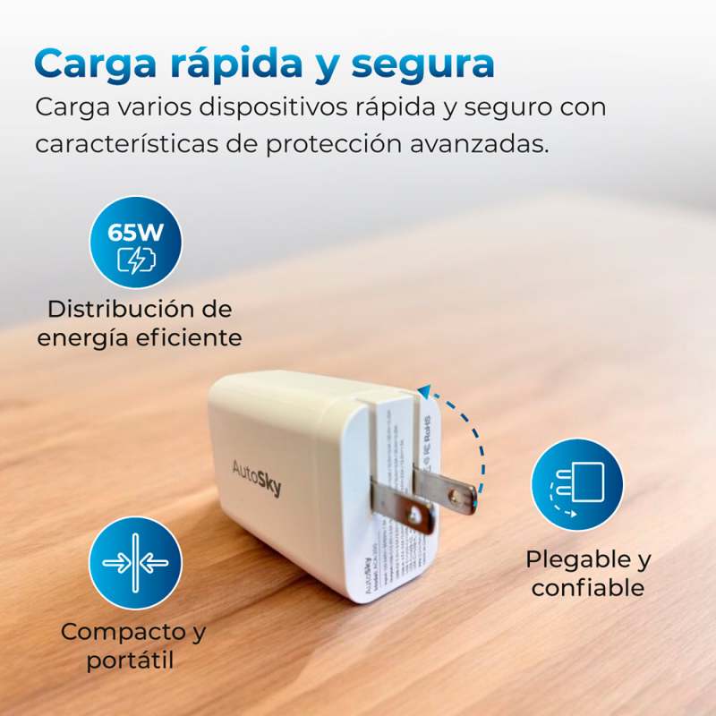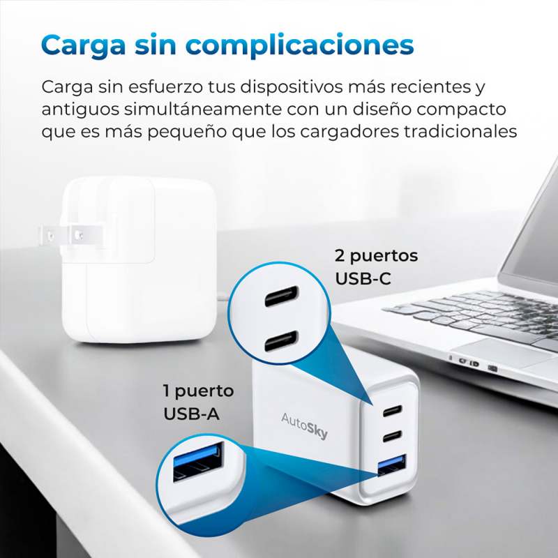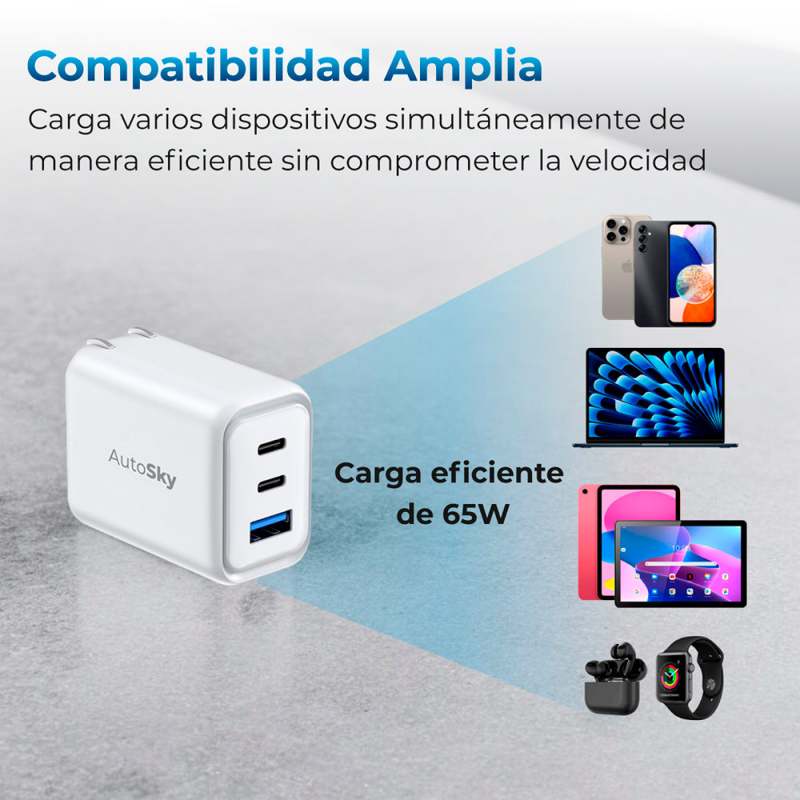 Adaptador De Carga De 65W De Última Generación, Diseñado Para Ofrecer Versatilidad Y Velocidad Con Dos Puertos Usb-C Y Un Puerto Usb-A. Distribuye La Energía De Manera Eficiente, Permitiendo Cargar Múltiples Dispositivos Al Mismo Tiempo Sin Comprometer La Rapidez.