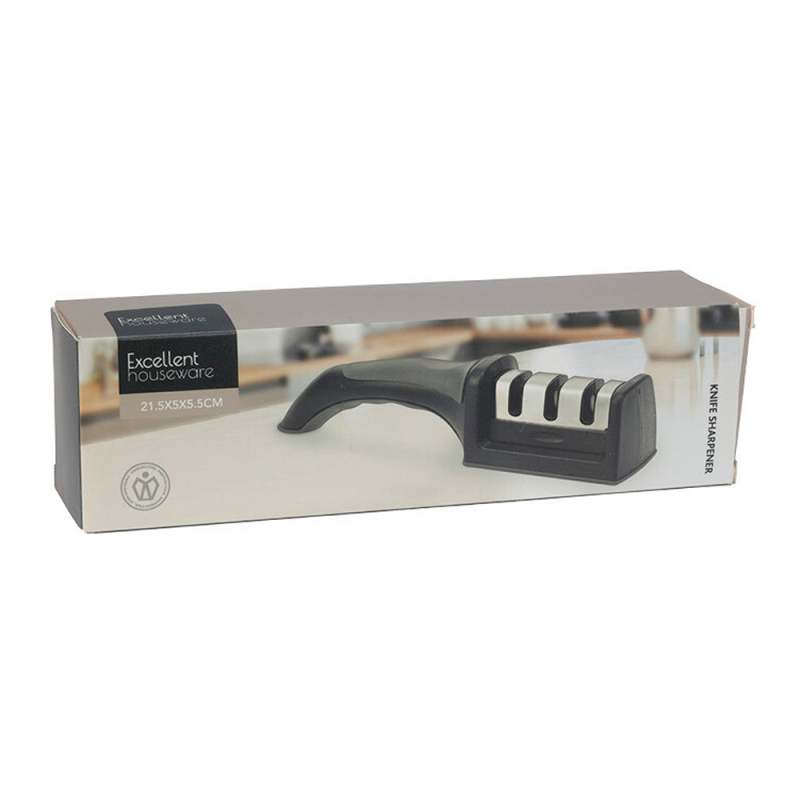 Afilador de cuchillos, Color Negro Acero Inoxidable, empuñadora en Polipropileno y tope gris, Tamaño: 21.5 x 5 x 5.5 cm. Peso: 150 Grs. Herramienta de gran utilidad, permitiéndote restaurar y mantener el filo de los cuchillos, logrando un corte más preciso y seguro.