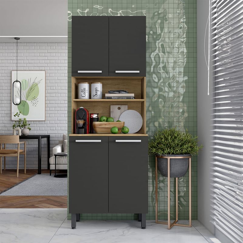 La parte superior de la alacena cuenta con dos elegantes gabinetes cerrados. En el centro, los estantes abiertos ofrecen un espacio generoso para platos y decoraciones, creando una sensación de frescura y organización. La sección inferior 2 puertas, proporcionando un almacenamiento oculto para todos tus esenciales de cocina.