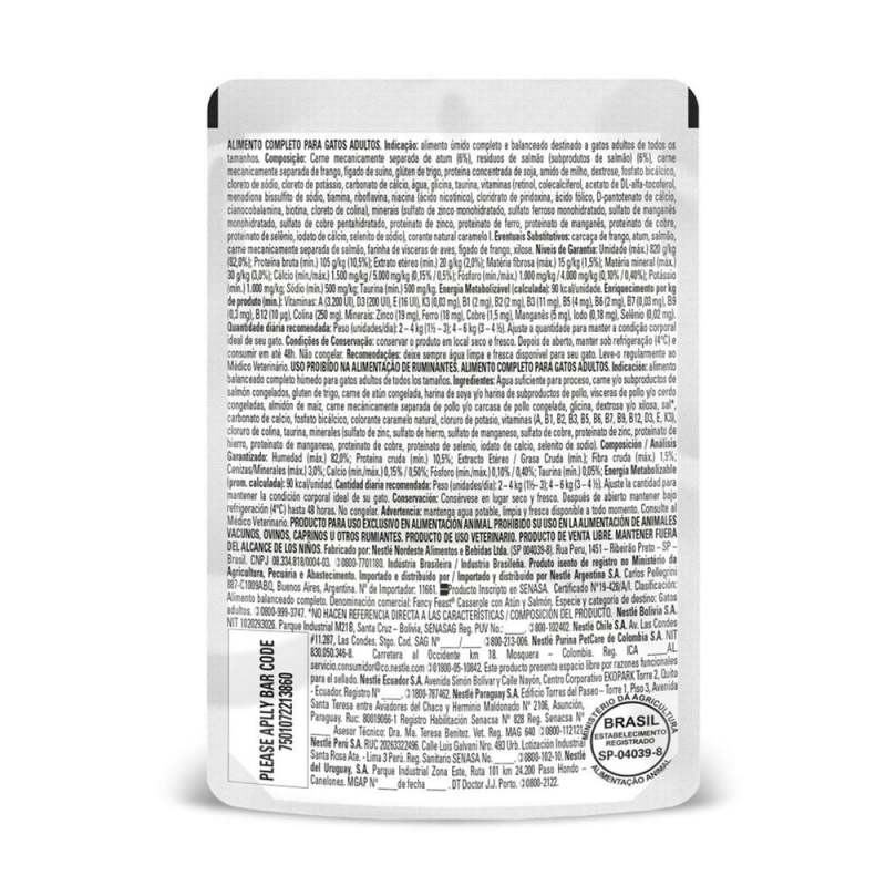 Fancy Feast Casserole Atún y Salmón es un alimento húmedo irresistible para gatos adultos, que combina trozos tiernos de atún y salmón en una salsa apetitosa. Elaborado sin colorantes artificiales, brinda una experiencia gourmet bajo el respaldo de Purina, en un práctico formato de 85 g.