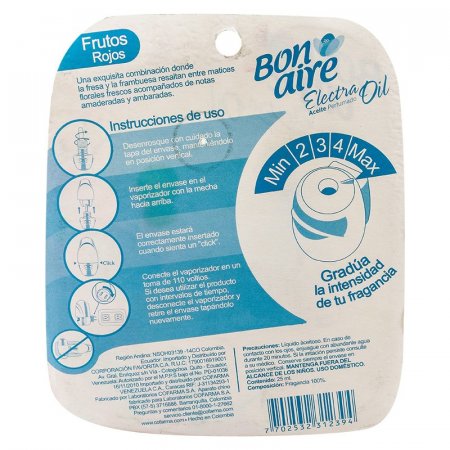 Set de ambientador y aceite aroma Frutos Rojos el cual incluye difusor eléctrico de acción continua. Tiene 5 niveles que permite graduarlos dependiendo de los requerimientos; es el complemento ideal para el hogar o la oficina, permitiendo bañar el ambiente de variedad de fragancias, desprendiendo aromas agradables que perduran agradablemente en el lugar. La fragancia del ambientador es concentrada y puede ser utilizada, por ejemplo, para eliminar los malos olores del cuarto de baño de forma discreta y fresca. Recomendaciones: El contenido de los ambientadores es considerado una mezcla infamable, por ende, no exponga a más de 50°c, no perfore ni incinere el envase. Se debe evitar el contacto con los ojos y mucosas. Mantenga fuera del alcance de los niños.