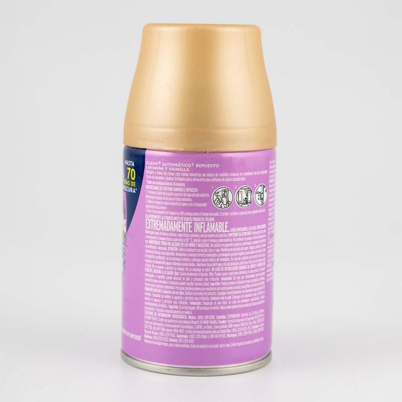 Aromatizante de ambiente en aerosol Repuesto automatico Dura hasta 60 dias Aroma a lavanda y vainilla Contiene 270ml.