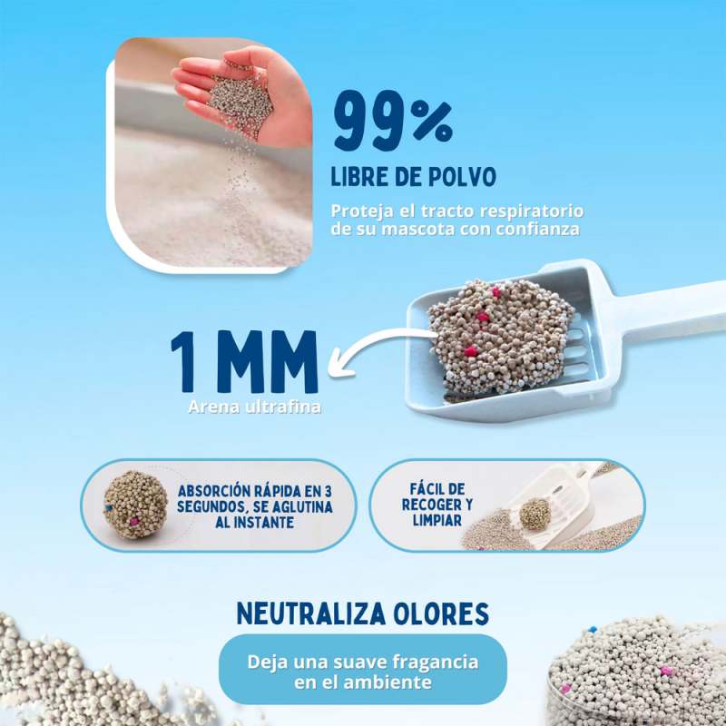 Arena sanitaria 4.5 kg con aroma a café. Hecha con bentonita 100 % natural, que forma grumos compactos para una limpieza fácil. Libre de polvo en alto porcentaje, controla los olores y evita que el olor fuerte se impregne en la casa. Ideal para gatos de raza pequeña o para uso en espacios reducidos.