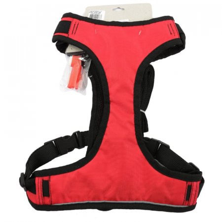 Arnes De Lujo Reforzado Para Perro Clark-Rojo Excelente pretal confeccionado en tela que permite la respiracion y de gran resistencia. Posee banda reflectiva en los laterales, hebilla de seguridad en cuello y de resina acetalica en pecho. Medidas en Centimetros: 34x17x27