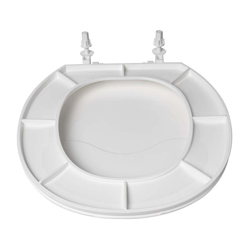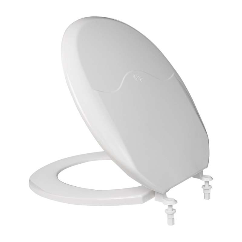 Asiento sanitario redondo blanco, compatible con sanitarios tradicionales. Medidas: Alto 4,5 cm, frente 35 cm, fondo 40,5 cm. Material: polipropileno.