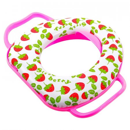 Asiento sanitario infantil elaborado en plástico. Color blanco con detalles en color rosado. Diseño de dibujos de fresas. Tiene asas laterales para poner y quitar del sanitario de manera más facil. Practico. Util para niños. Higienico. Elaborado en China.