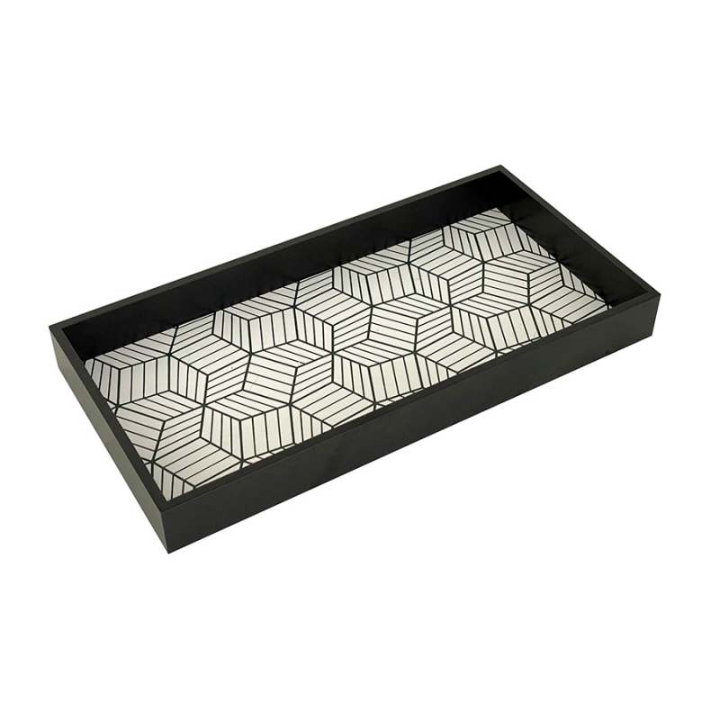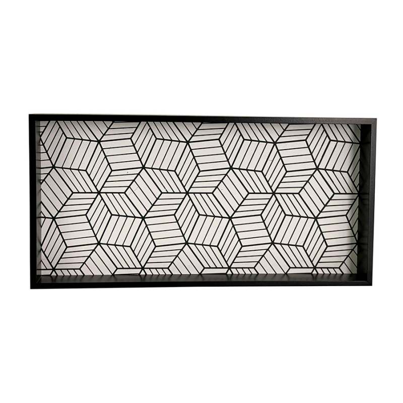 Bandeja decorativa Monocromía 44×4,6×22 cm, elaborada en MDF con diseño geométrico de cubos en blanco y negro. Su formato rectangular y acabado gráfico aportan un acento moderno y estructurado, ideal para organizar objetos o decorar superficies auxiliares. La combinación de tonos neutros resalta su estética contemporánea, perfecta para espacios sobrios, monocromáticos o de inspiración artística.