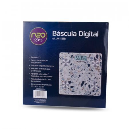 Mantente saludable y lleno de vitalidad gracias a esta báscula digital, la cual mide hasta 180 Kg y tiene una división total de 50 Gr. Gracias a su tamaño, es práctica para que la lleves a todos los lugares que desees visitar viendo en su hermosa pantalla LCD todas tus medidas y así mantengas el control de tu peso. Que sea digital hace que los resultados sean más precisos, y su increíble diseño hace que el peso se distribuya correctamente garantizando un margen de error casi nulo. Pantalla digital Marca: Neo Sens Modelo: AH1165A Peso Máximo 180 Kg Diseño imitación Terrazo Requiere 2 baterias AAA NO INCLUIDAS