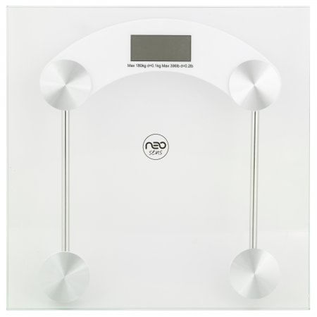Báscula digital. Marca: Neo Sens. Forma: cuadrada. Material: vidrio. Color: transparente. Cuenta con una pantalla lcd de 25mm, sensor de tensión de alta precisión, cristal de seguridad de 8mm, indicador de batería baja y sobrecarga, apagado automático, reajuste a cero automático. La báscula requiere una batería cr2032, máximo peso de 180kg.