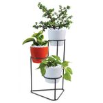 Soporte decorativo 9 Praga 03430182 para tres materas Material: Metal Color: Negro Dimensiones: Alto:30Cmts - Ancho:19Cmts - Profundo:19Cmts Peso: 0,15Kg