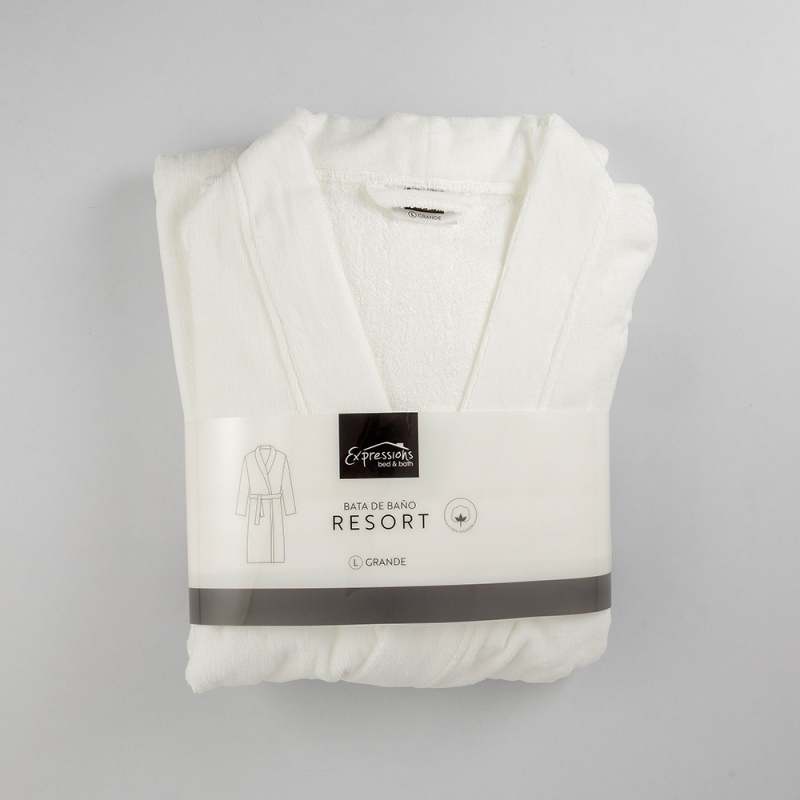 Bata de baño Expressions en color blanco, talla Grande, confeccionada en algodón 100% con un gramaje de 350 gramos. Tejido absorbente y suave que brinda comodidad y calidez