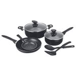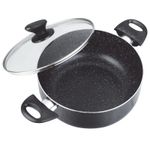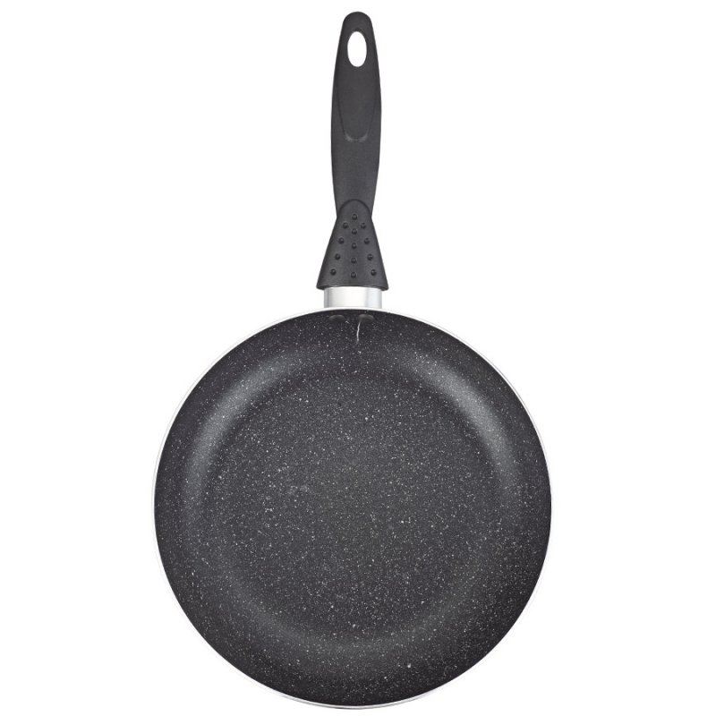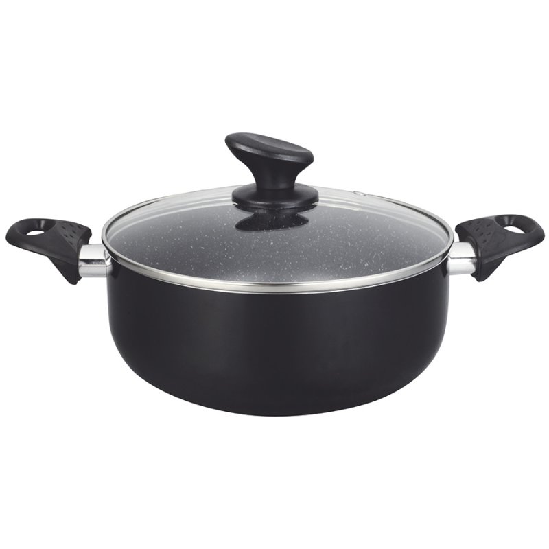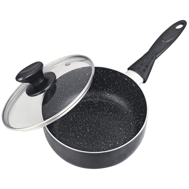Batería de Ollas en aluminio antiahderente con acabado stone Contiene: 1 Perol Diámetro 18cm X 7.5 de alto 1 Tapa de vidrio templado de 18 cm de diámetro 1 Olla Diámetro 24cm x 10cm de alto 1 Tapa de vidrio templado de 24 cm de diámetro 1 Sartén Diámetro 24 cm 1 Sartén Diámetro 14 cm 1 Espátula de nylon 1 Cucharón de Nylon.