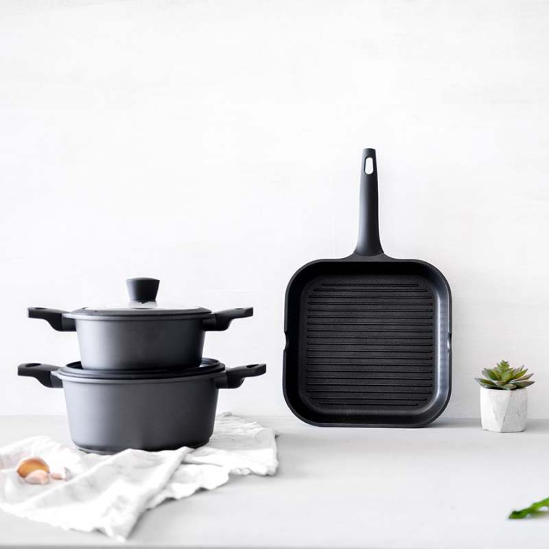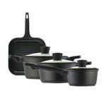 Bateria de Ollas contiene: Ollas de 20cm y 24cm con tapa, cacerola de 16cm con tapa y grill de 28cm.Línea de aluminio fundido de hasta 3.5mm de espesor. 2 capas de recubrimiento antiadherente Pfluon. Tapas de vidrio templado con válvula liberadora de vapor. Mangos, asas y pomos de baquelita soft touch atornillados. Fondo con placa de inducción.