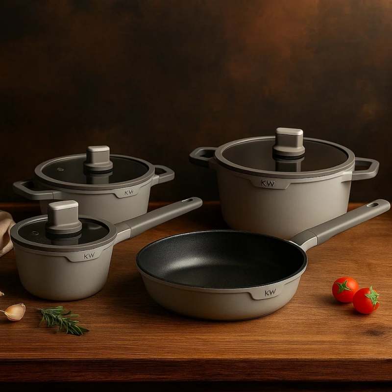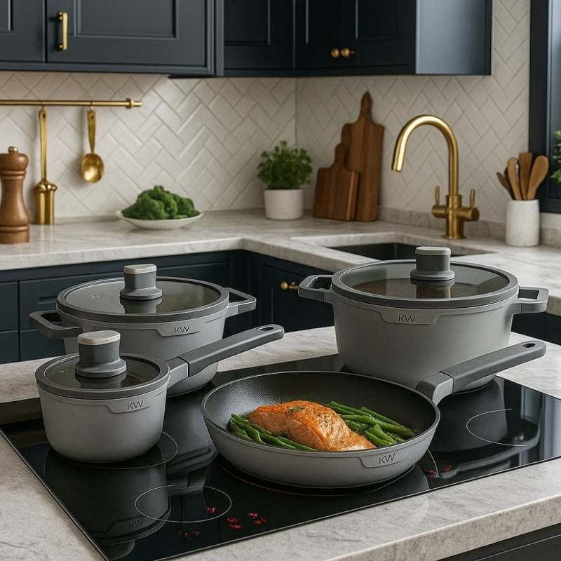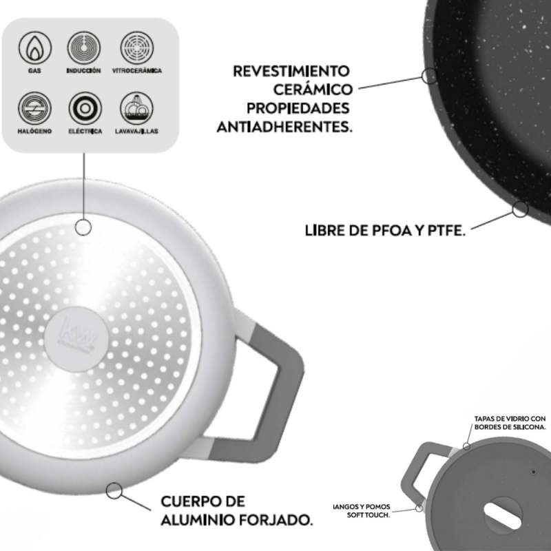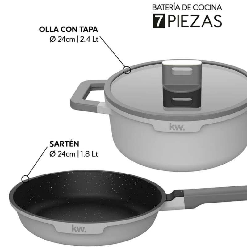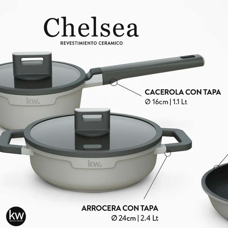 La batería Chelsea de 7 piezas en aluminio forjado gris está pensada para quienes buscan estilo, resistencia y practicidad en su cocina. Su tono gris sobrio aporta elegancia, mientras que su revestimiento cerámico La batería Chelsea de 7 piezas en aluminio forjado gris está pensada para quienes buscan estilo, resistencia y practicidad en su cocina. Su tono gris sobrio aporta elegancia, mientras que su revestimiento cerámico antiadherente te permite cocinar de forma más saludable y con menos aceite.antiadherente te permite cocinar de forma más saludable y con menos aceite.