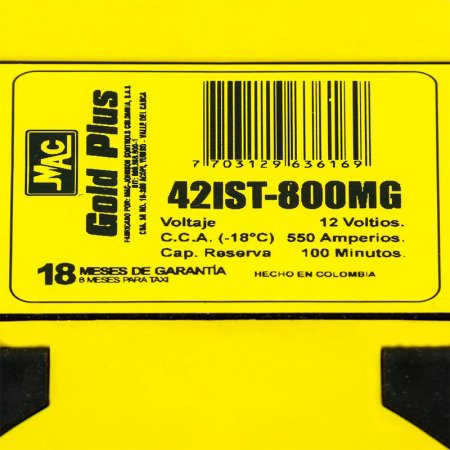 Llena de buena energía a tu vehículo con esta poderosa y durable batería Mac Gold Plus que HOME SENTRY te trae para que mantengas tu auto siempre listo y recargadoCaracterísticas:• Mayor duración• Tecnología avanzada que la hace libre de mantenimiento• Mayor energía y mayor seguridad• 12 voltios, 550 amperios, • Capacidad de reserva: 100 minutos• Producto reciclable• 18 meses de garantía total• Hecho en ColombiaIncluye1 batería para auto