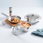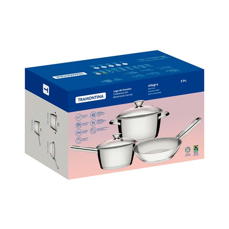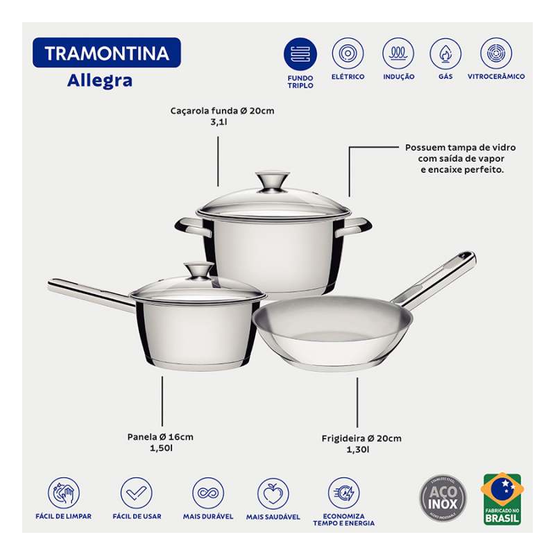 Batería de Cocina Tramontina Allegra, fabricada totalmente de Acero Inoxidable, Tapas de vidrio con salida de vapor y encaje perfecto. Incluye, 1 perol 16 cm. 1.5 Lts. con tapa, 1 olla 20 cm. 3.1 Lts. con tapa, 1 sartén 20 cm 1.3 Lts. El fondo triple (acero inoxidable + aluminio + acero inoxidable) distribuye el calor uniformemente, proporcionando una cocción más rápida y uniforme, ahorrando energía y manteniendo los alimentos calientes durante un tiempo mayor, no suelta ningún residuo en los alimentos, manteniéndolos saludables. Altamente durable, mantiene las características originales, conservando la belleza, higiene y durabilidad del material. Tiene un diseño moderno, con terminación en alto brillo. su diseño limpio y sin ángulos facilita la limpieza. Se puede lavar diariamente en lavavajillas. Se pueden usar en todo tipo de hornillas inducción, vitrocerámicas eléctricas, a gas.