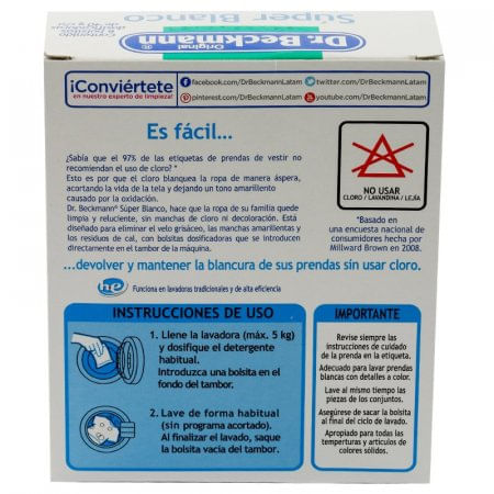 Blanqueador Súper Blanco 200553 240 Gr No te estreses refregando tu ropa blanca para que quede como nueva, usa este increíble blanqueador que gracias a sus componentes, te ayudan a dejar tu ropa intacta a pesar de que pase el tiempo. Siéntete el más cada que utilices prendas de vestir blancas, ya que gracias a este producto, siempre estarás reluciente, sin miedo a que te vean las manchas de grasa o amarillentas, que deja el constante lavado de ropa. Además evita que se percudan tus prendas, ya que no tiene cloro. Así dejas de lado blanqueadores de ropa ásperos, que no te garanticen resultados útiles e inmediatos. Es momento de que todo tu closet brille más que las estrellas, ¡Arriésgate! Sin cloro Elimina el velo grisáceo Elimina las manchas amarillentas Elimina los residuos de la cal Evita el percudido