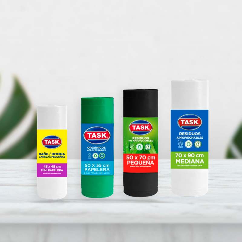 Bolsas para la basura de alta calidad, resistentes al peso, punción y desgarro son fabricadas con materiales 100% reciclados y reciclables. Color Negro para residuos no aprovechables; Color blanco para residuos aprovechables; color verde para residuos orgánicos aprovechables . Ideal para cocinas, baño, oficina y patios. Viene un rollo de cada tamaño y color básico para el hogar.