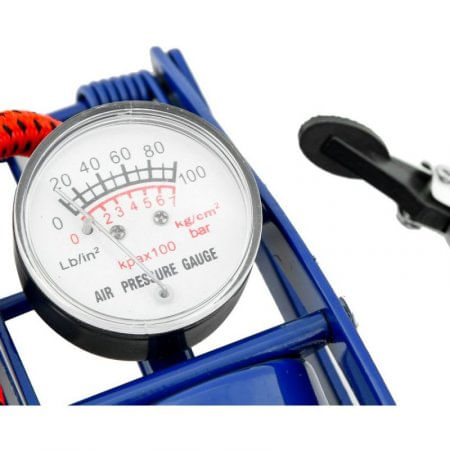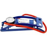 Material: plástico, goma y acero. Bomba de aire con sistema de funcionamiento de pie. Alto volumen: 100PSI. Infla rápidamente balones, llantas, juguetes y accesorios de plástico inflables. Resistente y fácil de transportar.