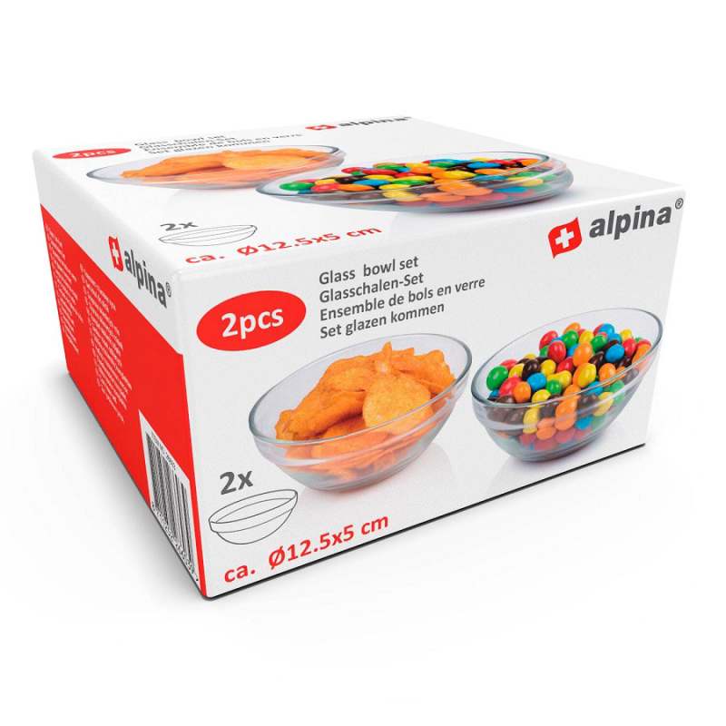 Bowl tazon 2 piezas. Marca: Alpina. Capacidad: 700ml. Material: vidrio. Transparente. Medidas: 12,5x5cm. Peso: 0,376Kg. Atributos adicionales: Diseño ergonomico. Sirve para servir cualquier tipo de comida. Facil de limpiar.