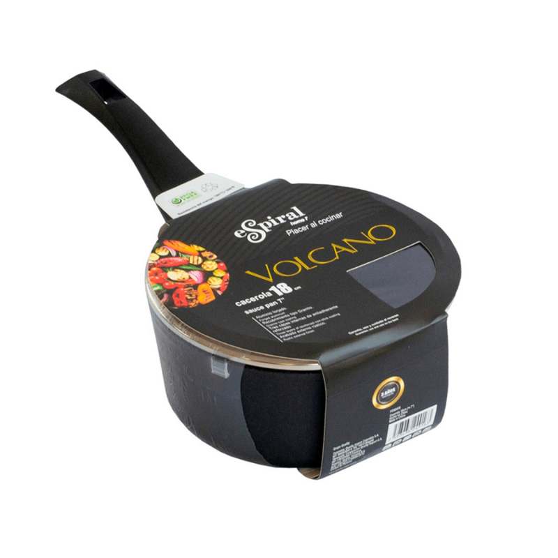 Cacerola Volcano de 18 cm con tapa, fabricada en aluminio forjado con 4 mm de espesor para una distribución eficiente del calor. El recubrimiento de 4 capas reforzadas proporciona una superficie antiadherente de larga duración. Incluye tapa ajustada y mango de baquelita resistente al calor. Apto para lavavajillas y se recomienda utilizar utensilios de cocina no metálicos para preservar la superficie antiadherente. No es compatible con cocinas de inducción.