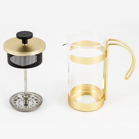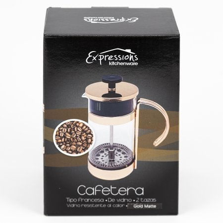 Cafetera elaborada en vídrio y acero. Diseño tipo cafetera francesa. Capacidad de 2 tazas. (100ml) Tiene oreja lateral para mejor agarre. Tiene filtro incluído. Tamaño ideal para cualquier espacio. Tiene tapa con embolo. Color Golden Matte.Marca Expressions con variedad de productos de cocción y utensilios. confiables y de gran durabilidad que podrán convertirse en tus aliados a la hora de realizar tus actividades diarias sin problema alguno. 1-021-2Gd