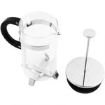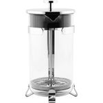 Material: Acero, Vidrio y PVC. Capacidad: 8 Tazas. Diseño: Tipo Francesa. Vidrio resistente al calor. Asas fabricadas en PVC. No es apta para usar directamente en la estufa.