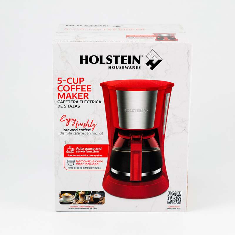 Cafetera Holstein Rojo 5 Tz 550 W Plastico Hh-0914701R Esta cafetera es lo necesario para tu cocina no hay nada que de mejor los buenos días que un buen café con diseño moderno y liviano perfecto para todo tipo de cocinas con ella podrás preparar hasta 5 tazas, con una sola carga función para mantener el café caliente durante mayor tiempo sin necesidad de estar presente ideal para dejarlo caliente mientras se despiertan el resto de la familia incluye un filtro y una cuchara medidora para que la puedas disfrutar de ella desde el minuto en que la recibas. Siempre se recomienda tomarse el tiempo necesario para hacer una buena elección de los productos que utilizaremos en nuestro hogar y sobre todo para equiparlo ya que de ello depende el buen estado del mismo y permite realizar las tareas domesticas mas sencillas: esta marca se distingue por la calidad y rigurosidad en la elaboración de todos sus productos. No te arrepentirás sin duda alguna de tu elección. Practica y versátil. Capacidad de 0.75 litros o 5 tazas. Función anti-goteo. Placa anti adherente. Mantiene caliente el café. Incluye filtro y cuchara.