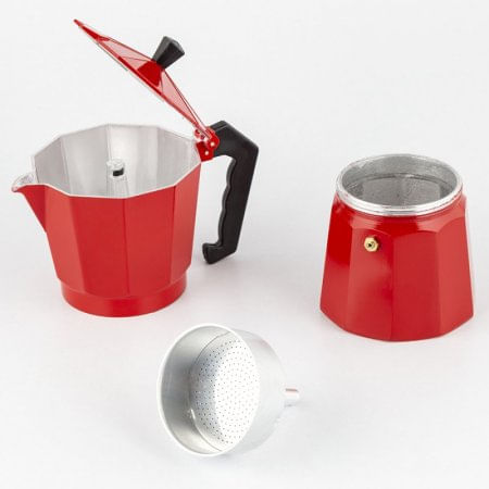 Cafetera en aluminio. Capacidad de 9 tazas. Color rojo. Diseño de asa ergonómico. Tiene válvula de seguridad. De fácil uso. Tapa que abre en sentido vertical. Marca Expressions con variedad de productos de cocción y utensilios. confiables y de gran durabilidad que podrán convertirse en tus aliados a la hora de realizar tus actividades diarias sin problema alguno. Hf3-3