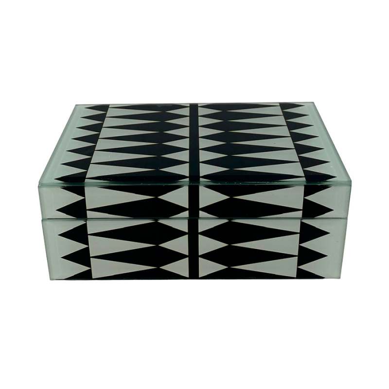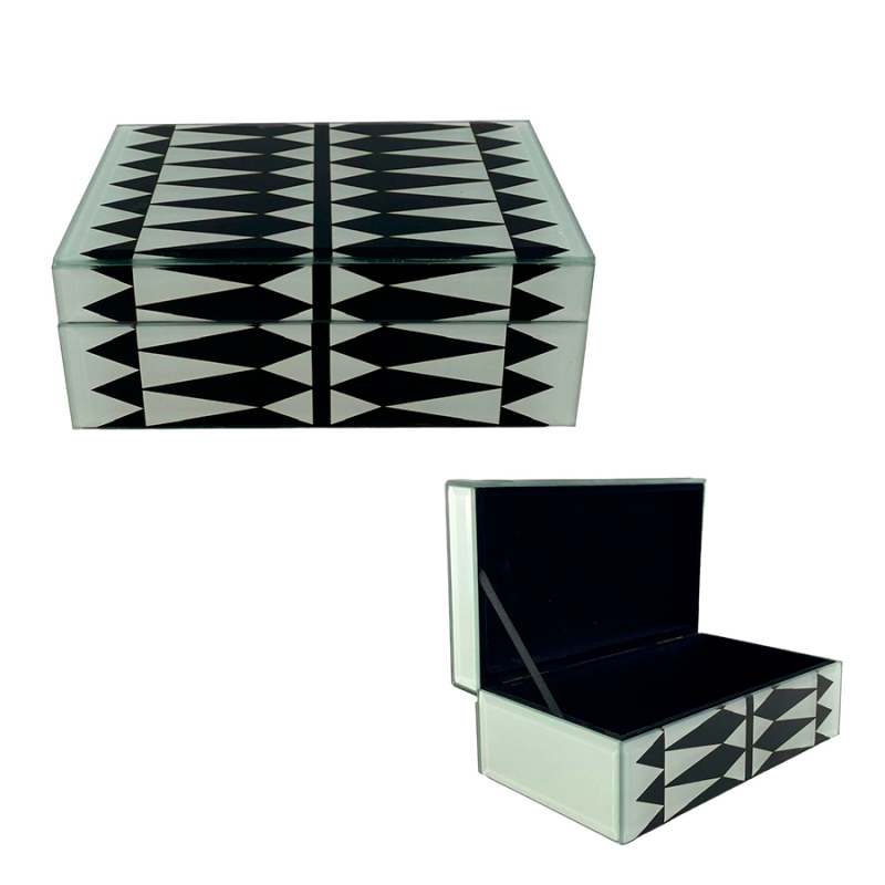 Caja decorativa Monocromía 20×8×12 cm, elaborada en vidrio con estructura en blanco y negro. Su diseño limpio y proporciones rectangulares permiten organizar pequeños objetos con elegancia y discreción. La combinación de tonos neutros y superficies translúcidas aporta sofisticación visual, integrándose con armonía en espacios contemporáneos, sobrios o de inspiración monocromática.