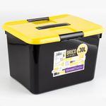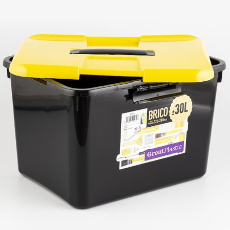 Caja Organizadora Marca Brico Great Plastic Color Negro Con Tapa Color Amarillo Trafico Pesado Capacidad 30 Litros