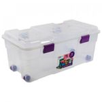 CAJA ORGANIZADORA GREAT PLASTIC CON RUEDAS Y 4 CIERRES-Transparente Organiza tu ropa o elementos de hogar con esta practica caja la cual puedes guardarla en cualquier lugar. Posee ruedas para un mejor arrastre. Elaborada con plastico de alta calidad. Su tapa permite una conservación perfecta de los elementos, cubriendolos del polvo y humedad.