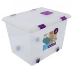 Caja Organizadora Great Plastic 52lt-Transparente Caja organizadora de 52 litros Great Plastic. Elaborada en plastico de alta calidad. Ideal para guardar juguetes,ropa, utensilios de cocina y del hogar. Posee ruedas para su desplazamiento y manijas sugetadoras en su tapa y una toma de aire para mantener los productos secos y libres de humedad o malos olores. Color: transparente con morado. Medidas en Centimetros. 40x40x50
