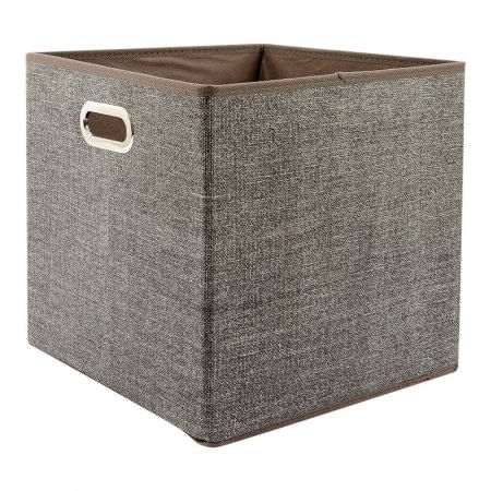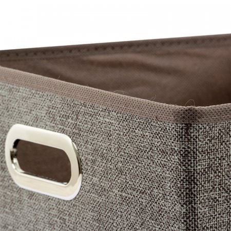 Caja de tela elaborada en polipropileno no tejido. Superficie lisa. Contraste mate. Forma cuadrada. Color café. Tiene asa en la parte frontal. En la parte inferior tiene cremallera y fondo. Practica. Organizadora. Para todo tipo de objetos. Elaborada en China.