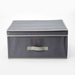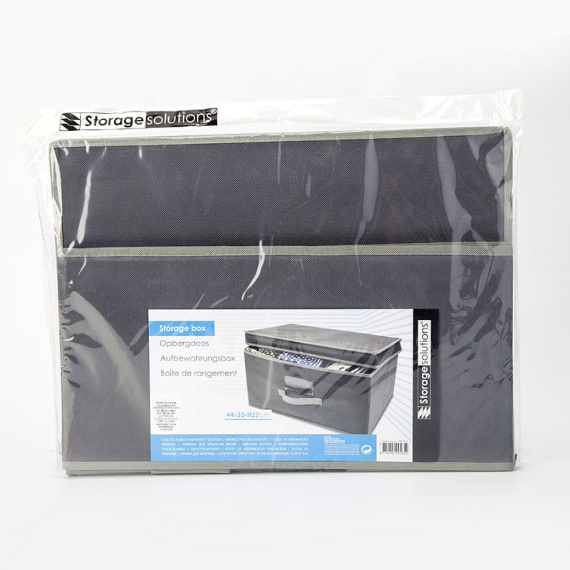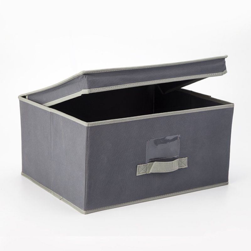 Caja de almacenamiento con tapa abatible no tejida 80 gsm cartón de 2 mm, tamaño 44x33x22cm, con asa gris oscuro no tejido, bolsa opp
