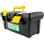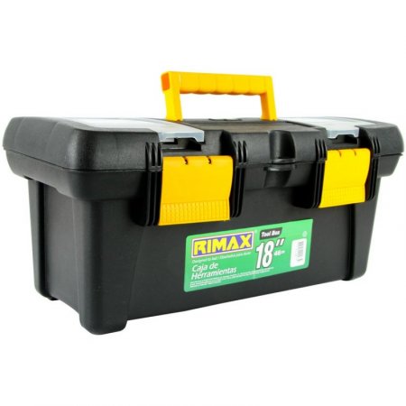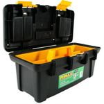 Material: plástico. Caja organizadora de herramientas u otros elementos y accesorios. Manija de agarre en la parte de encima. Pestaña de cierre a presión en la mitad de la caja. Incluye bandeja organizadora. 5 compartimientos pequeños. Dos compartimientos alargados. La caja es de forma rectangular. Material resistente y diseñado para durar.