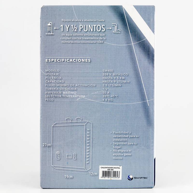 calentador de agua instantáneo que abastece toda la red de agua caliente. control digital para la programación de la temperatura exacta de salida. no requiere ventilación ni revisiones técnicas periódicas. tecnología micro-controlada. doble sensor de temperatura: termistor de control y termistor de seguridad. certificado retie.garantía: 3 años* (*garantía extendida para equipos instalados con la marca y registrados según certificado de garantía)conexión red de agua: 1/2'sistema de seguridad de válvula de sobrepresión: recomendada adicionalselector de temperatura: digital de 20°c - 45°cfabricación: nacionalencendido: electrónicotipo de encendido: automático. a partir de 2.5 lt/minuso: doméstico, comercial, industrialamperaje: 50 a