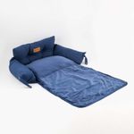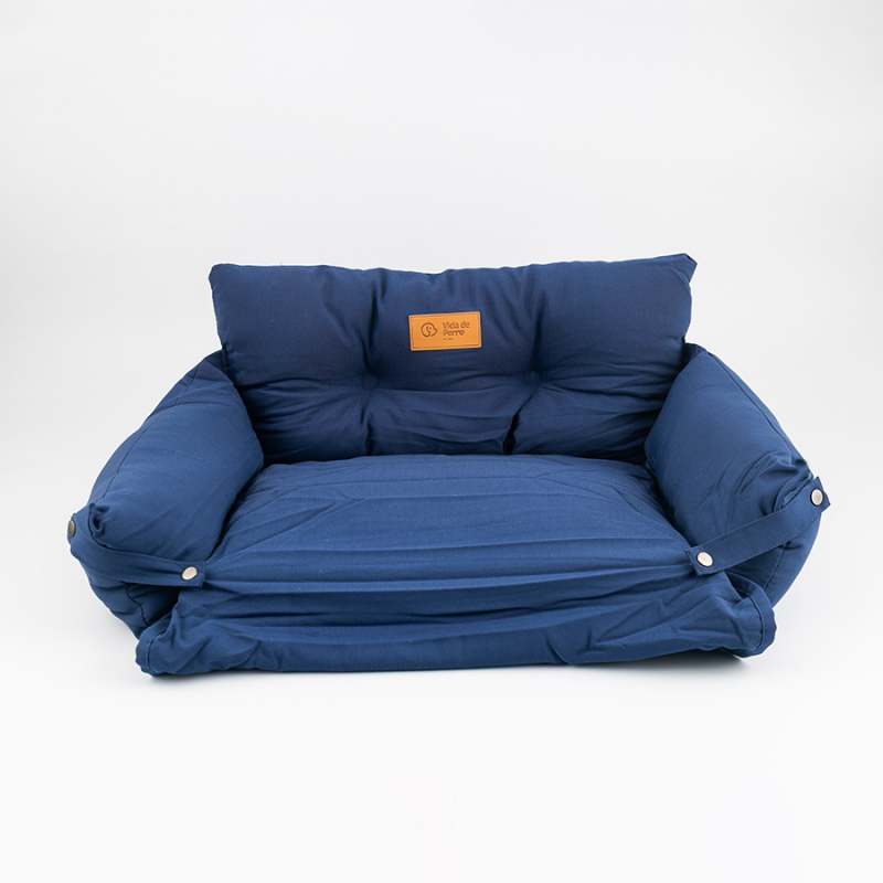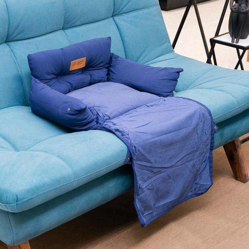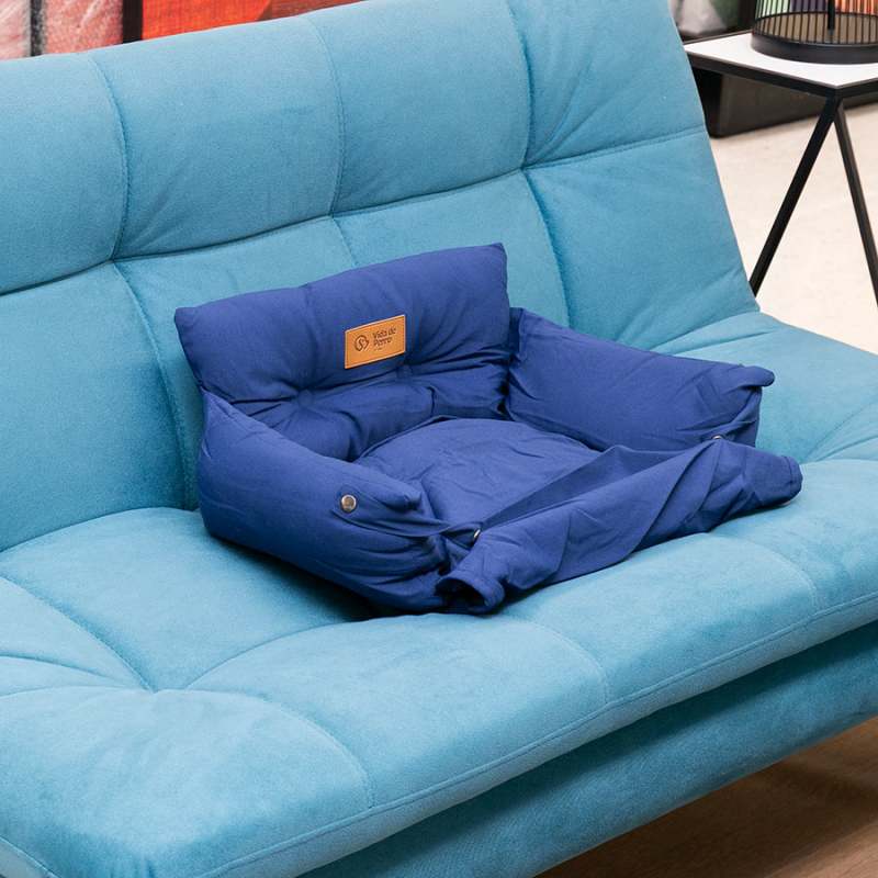Cama tipo sofá para perros pequeños, fabricada en algodón suave con acolchado cómodo. Su diseño compacto y moderno en color azul es perfecto para cualquier rincón del hogar.