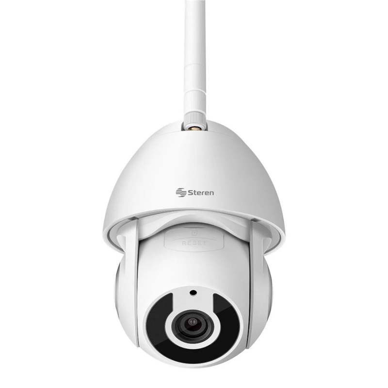 Con esta cámara de seguridad Wi-Fi exterior, monitorea cualquier lugar a través de tu celular. Conéctala por Wi-Fi o cable Ethernet a tu módem y configúrala con nuestra app Steren Home (disponible en App Store* y Google Play*), para controlar su movimiento y todas sus funciones. Gran resolución: La cámara tiene 3 Mega pixeles de resolución, esto significa un 50% más que Full HD, por lo que podrás visualizar imágenes, como rostros o placas, con excelente nitidez y detalle. Movimiento: Controla con tu celular el desplazamiento horizontal o vertical de la cámara, para vigilar todo alrededor. Detección de movimiento: Recibe una notificación en tu celular, en caso de actividad. Seguidor de movimiento: Detecta la presencia de alguien o algo y lo sigue en su recorrido, siempre que esté dentro del ángulo de visión. Control con más de un celular: Comparte el control de la cámara con más usuarios, lo único que deben hacer es descargar la app y registrarse. Visión nocturna: Los LED infrarrojos proporcionan a la cámara de seguridad exterior visión nocturna que te permitirá vigilar y monitorear aun en la oscuridad. Audio bidireccional: Esta cámara de vigilancia exterior incorpora comunicación bidireccional, esto quiere decir que tiene micrófono para que escuches lo que sucede, y bocina para que te oigan en donde está instalada, mientras ves todo en tiempo real. Graba en microSD1: Los videos se guardan en una memoria microSD que puede ser de hasta 128 GB de capacidad. Para uso en exterior: Sus materiales y grado de protección permiten instalarla en exteriores, para monitorear fuera de tu casa o negocio. 1De venta por separado Alimentación: 5 V--- 1 A Iluminación mínima: 0,01 lx Compresión de video: H.265 2 304 x 1 296 Protocolo: TCP/IP Red inalámbrica: 802.11b/g/n Red alámbrica: Fast ethernet 10/100Mbps Convertidor de voltaje: 100 – 240 V~ 50 – 60 Hz 0,2 A Salida: 5 V--- 1 A