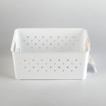 Canasta de plástico blanco, tamaño mediano de 25x18x18 cm, perfecta para almacenamiento en el hogar.