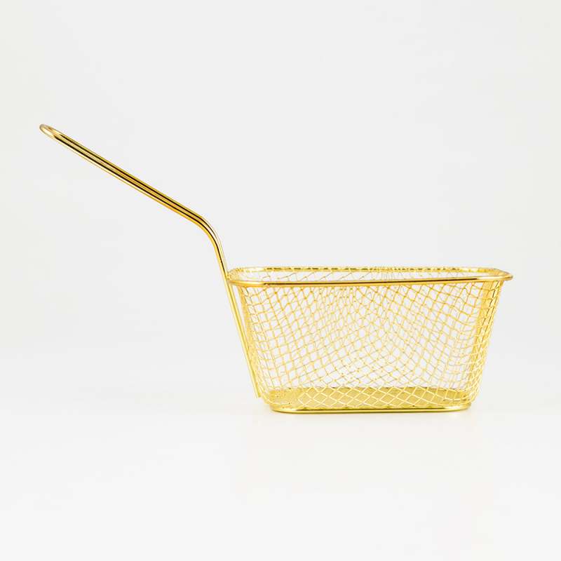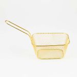Freidora - Canastilla, Dorada en Metal, Dimenciones: 23 x 11 x 13.5 cm. Peso: 81 Grs. Posee Asa de agarré. Adecuada para cocción papas fritas y otras guarniciones.