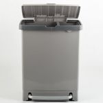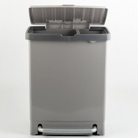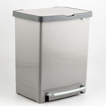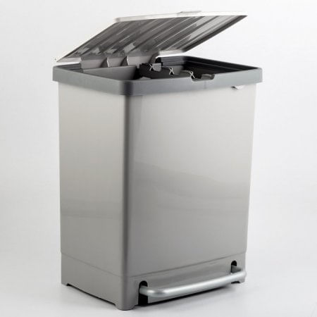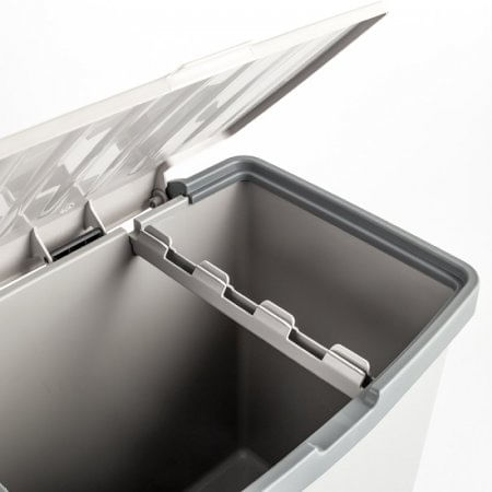 Papelera Tatay de reciclaje con separador 17+8 litros con posibilidad de 2 compartimentos, gracias a su marco separador, diseñado y fabricado en España por Tatay. Combina 3 tonos de gris, y presenta el pedal en gris acabado metalizado.