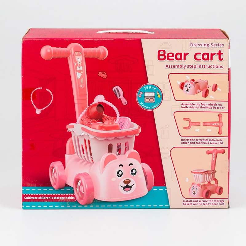 Carro de belleza, juego de simulación diseño oso, incluye 1 canasta, 2 cepillos, 1 lentes, 1 secado cabello, a espejo, 1 collar, 1 papel, 1 labial, 1 sticker, 4 ruedas, 1 juego de sombras, 2 botellas, 2 rollos, 2 aros, 1 base, material seguro y fabricado con plàstico de calidad, tu niña experimentará diferentes formas de entretenerse despertando su creatividad e ingenio, promueve coordinación manos -ojo y habilidades motoras finas, dimensiones del producto 39x12x32cm. Edad recomendada de uso mayor de 3 años.