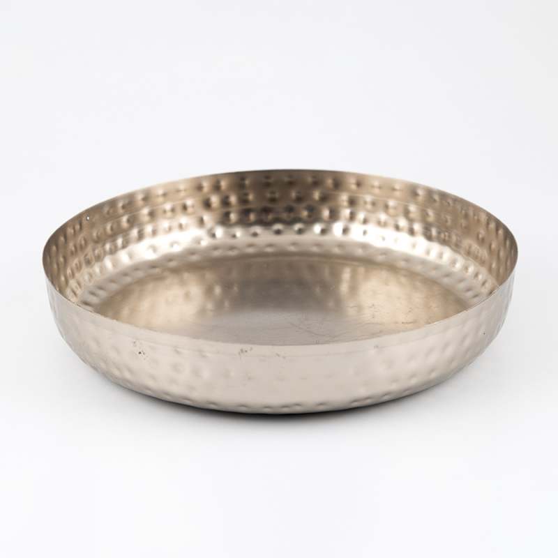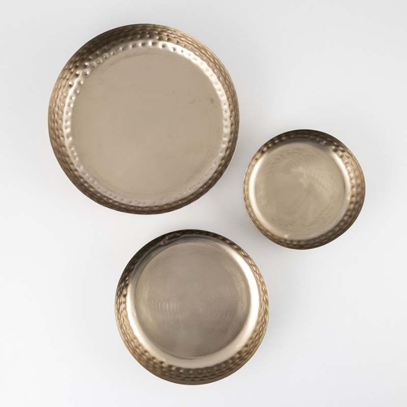 Bandeja decorativa color plateado x3 piezas. Acabado martillado en oro, hierro. Medidas: pequeña 19x19x5cm, mediana: 25x25x5cm, grande: 30x30x6cm.