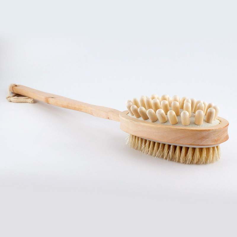Cepillo para cuerpo doble, tiene un elegante diseño en acabo de madera, es largo alcanza a llegar a zonas de dificil acceso como la espalda. Dimensiones: 41cm de largo