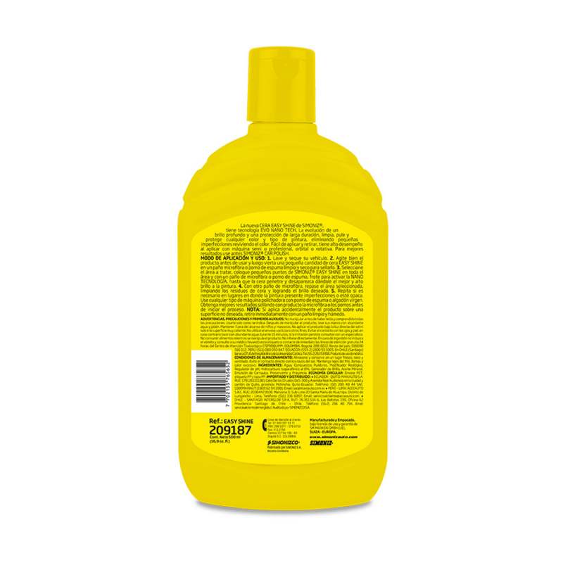 La nueva cera Easy Shine de SIMONIZ tiene tecnología EVO NANO TECH. La evolución de un brillo profundo y una protección de larga duración. Limpia, pule y protege cualquier color y tipo de pintura, eliminado pequeñas imperfecciones reviviendo el color. Fácil de aplicar y retirar, tiene alto desempeño al aplicar con máquina semi o profesional, orbital o rotativa. Para mejores resultados use antes SIMONIZ CAR POLISH