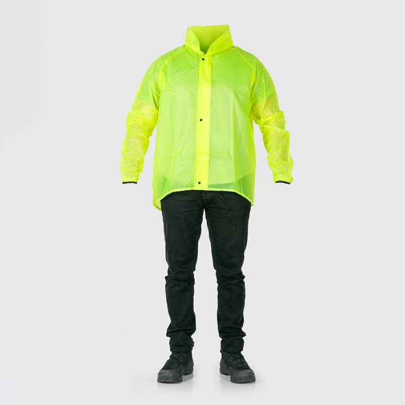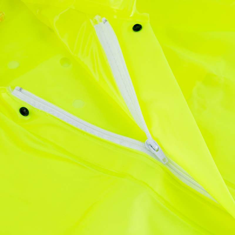 Chaqueta impermeable sellada por electro-frecuencia. Doble cierre de cremallera y broches con falsa espalda, perforaciones para ventilación y reflectivo. Más larga atrás para guarda-barros y corta adelante para que no se empoce el agua al pedalear. Cuello guarda-capota y puños con caucho. Material suave, no adquiere mal olor. Pvc siliconado calibre 8. Reforzada en la zona de las axilas. Color amarillo limón. Para uso a la intemperie. Es ideal para movilidad en bicicleta, patineta eléctrica y para uso casual.